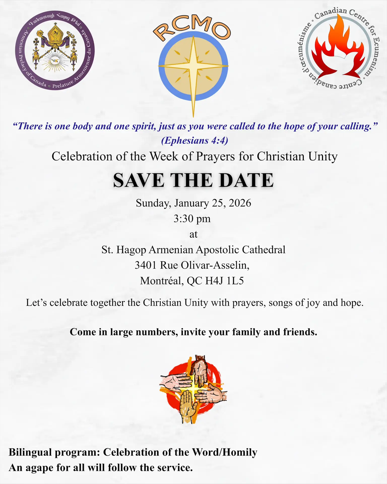 You are welcome to join our bilingual Ecumenical Celebration (in French and English) with an ecumenical choir on January 18th to open the Week of Prayer for Christian Unity 2026. Our celebration follows the Order of Worship proposed jointly by the Dicastery for Promoting Christian Unity and the Faith and Order Commission of the World Council of Churches.